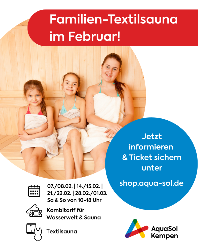An den Wochenenden vom 07.02.2026 bis zum 01.03.2026 verwandelt sich unsere Saunalandschaft in eine Familien-Textilsauna. Nutzen Sie unsere Schnupperwochenenden und wechseln Sie zwischen Wasserwelt und Sauna mit unserem Kombi-Tarif!